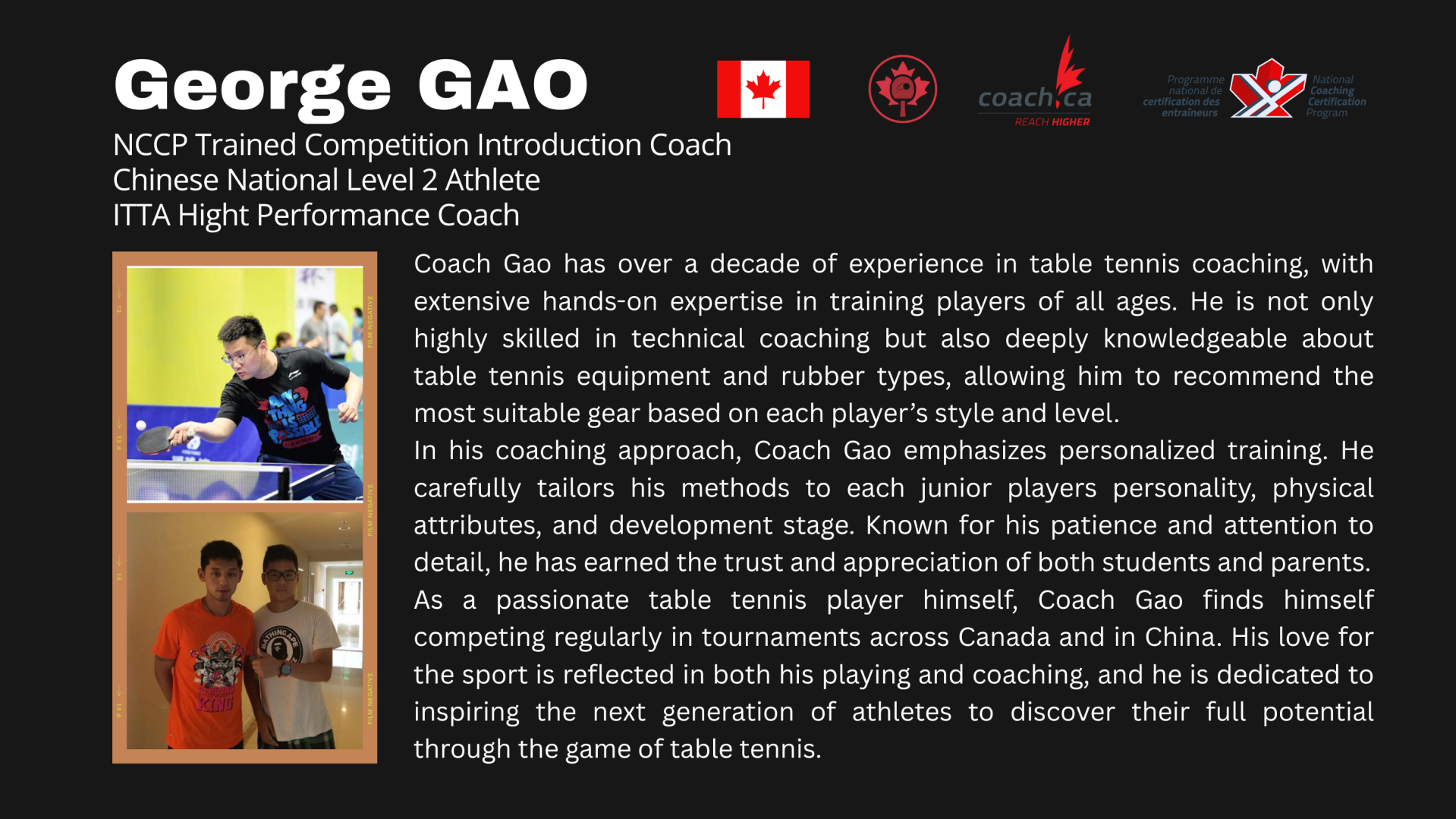Our coaching team is made up of ten passionate and driven young coaches, all professionally trained under the guidance of Table Tennis Canada and the Coaching Association of Canada. Our youth coaches bring energy, ambition, and a strong commitment to excellence, creating a structured and inspiring high-performance training environment.