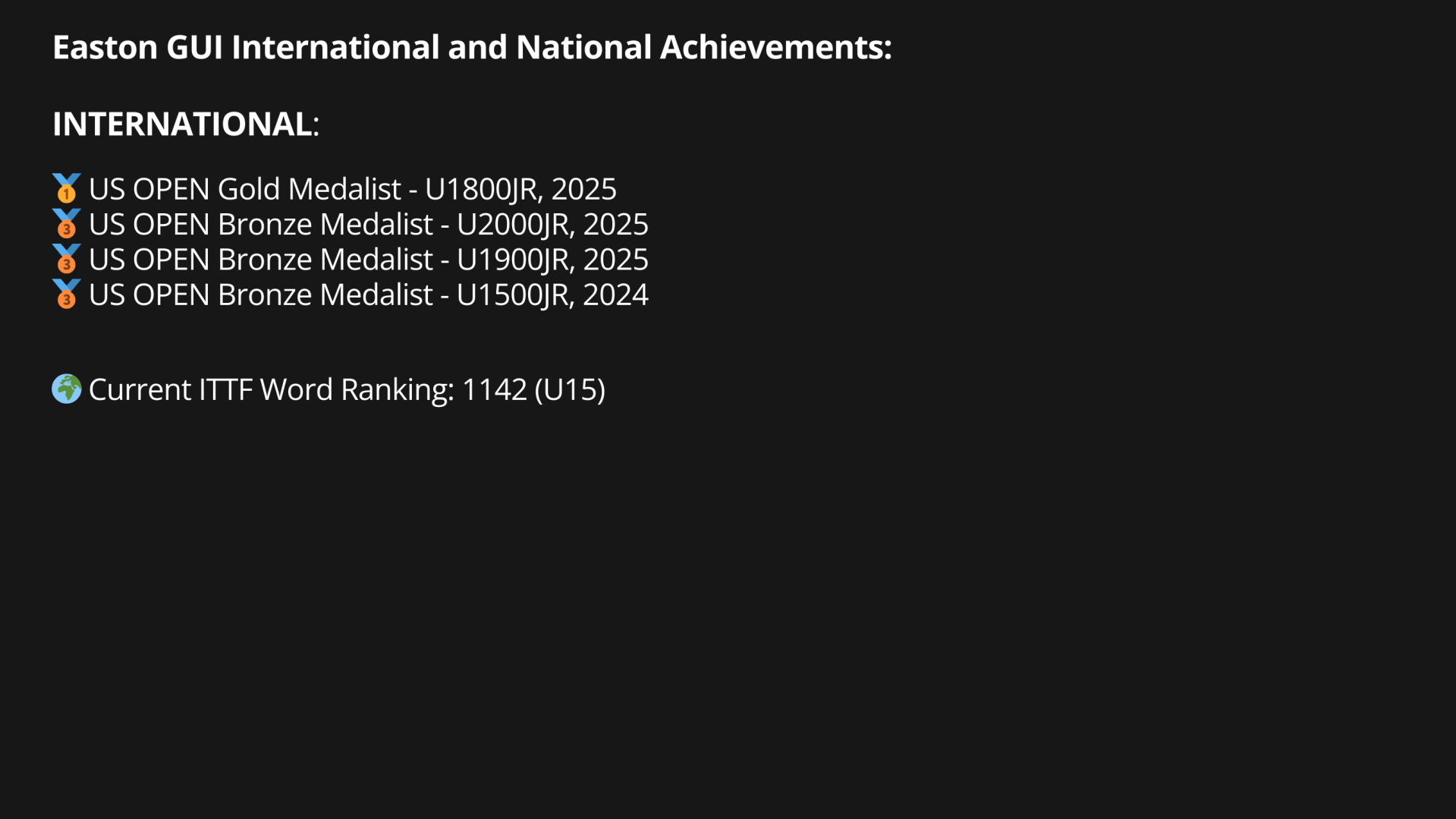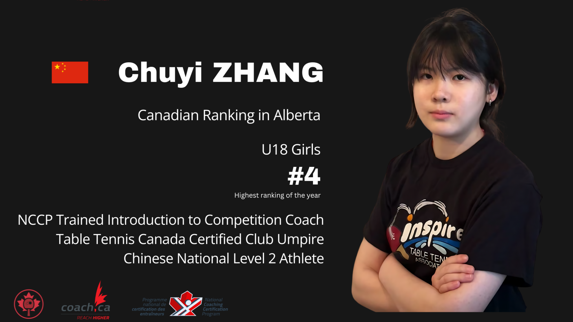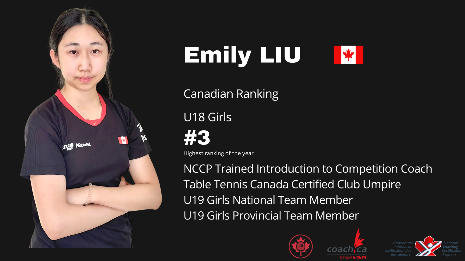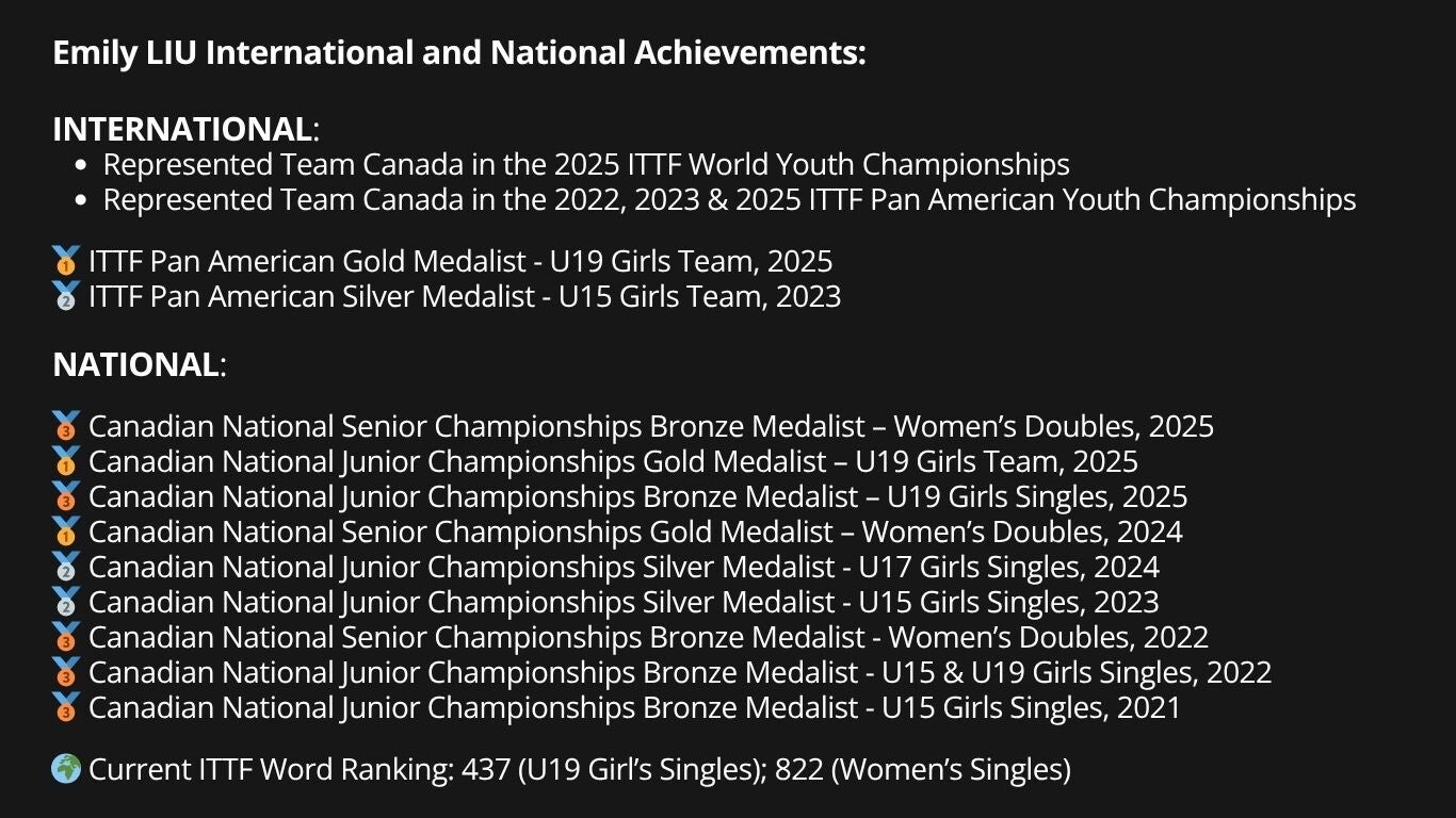 Coach Emily Liu - U19 Girls National Team member, trained under Table Tennis Canada Program.